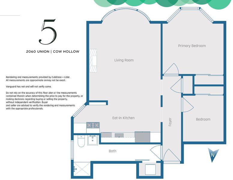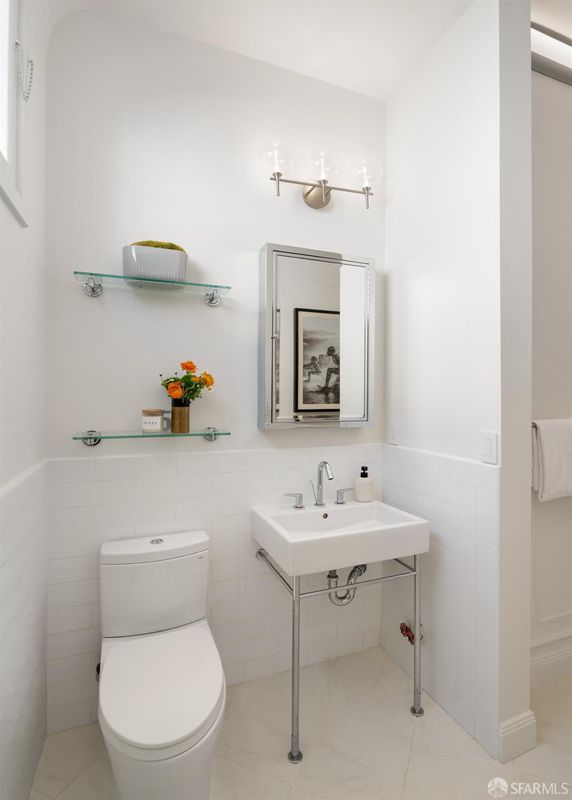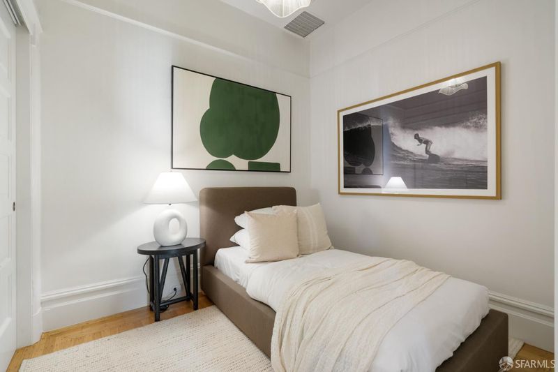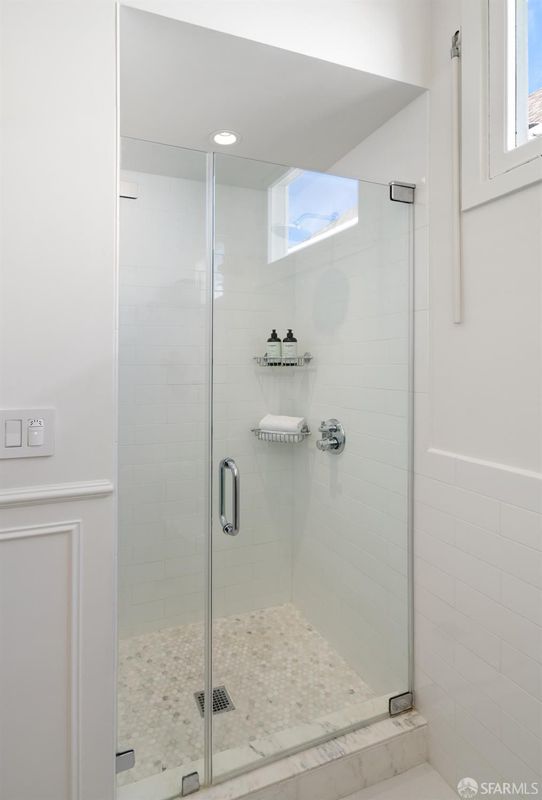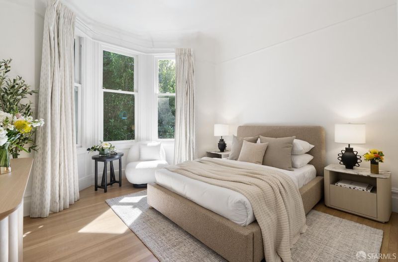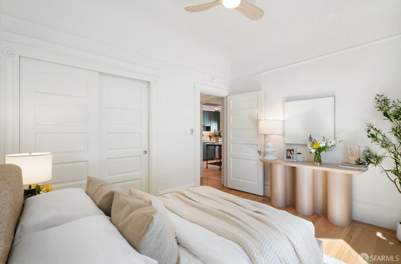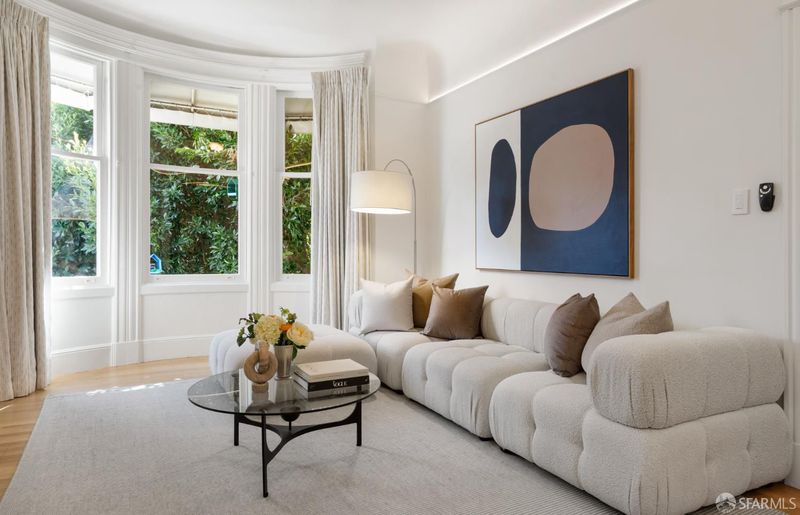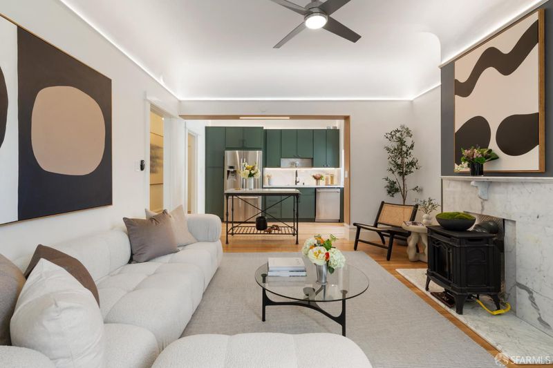 Set just above the energy of Union Street in Cow Hollow, Number 5 at 2060 Union is a condominium that gets it right classic San Francisco architecture, thoughtfully updated for how people actually live. Nearly 800 sq ft, no shared walls, parking, and dedicated storage. The kitchen has just been updated and it shows: forest green soft-close cabinetry with matte designer hardware, leathered Bianco Accacio calcite marble countertop, and a translucent illuminated backsplash that glows. Hansgrohe faucet, InSinkErator disposal, Blanco undermount sink. LED undercabinet, shelf and uplighting plus track task lighting built around a vented Thermador 36 gas range with BBQ briquette grill, Samsung refrigerator, and dishwasher. A warm wood arch with integrated LED lighting connects it all to the living area. The living room is comfortable and inviting: curved bay window with a leafy canopy that filters light and gives privacy, marble fireplace surround, period millwork, and LED cove lighting that sets the mood. Ceiling fans in both the living room and bedroom. Refinished oak floors run throughout. The bedroom is well-proportioned and quiet with an LED-lit closet. The bright bath has heated floors, a glass-enclosed tile shower, metal and porcelain vanity, and a large awning window above a new Toto toilet. Full-size stacked laundry closet just inside. The second room is flexible guest space, office, or both. There are 7 units at 2060 Union, with detached garage, separate storage, and a modern intercom and remote door gate control that allows for secure package delivery.