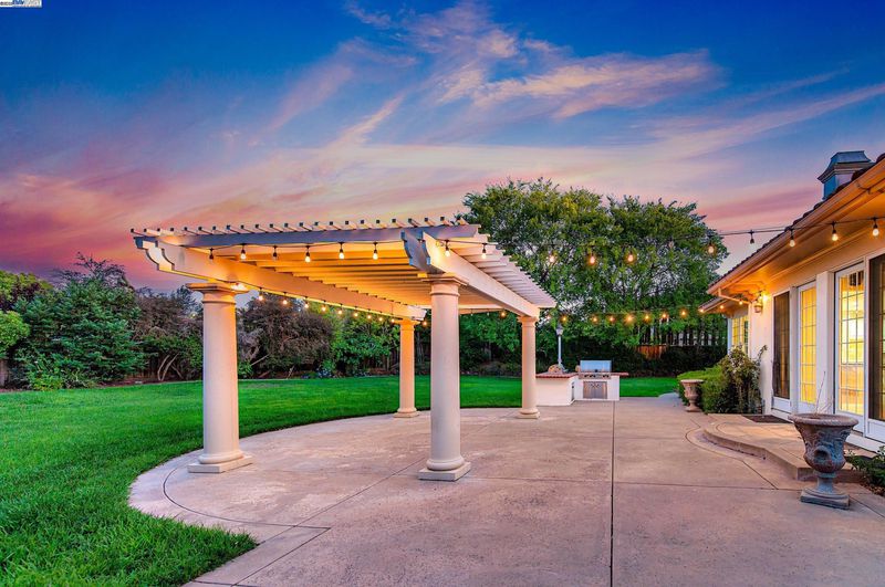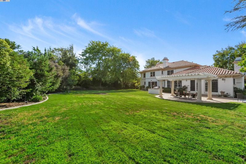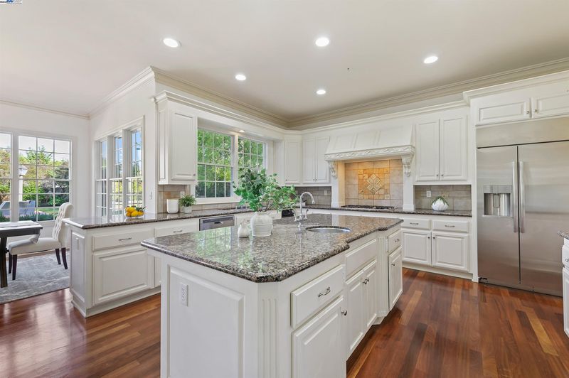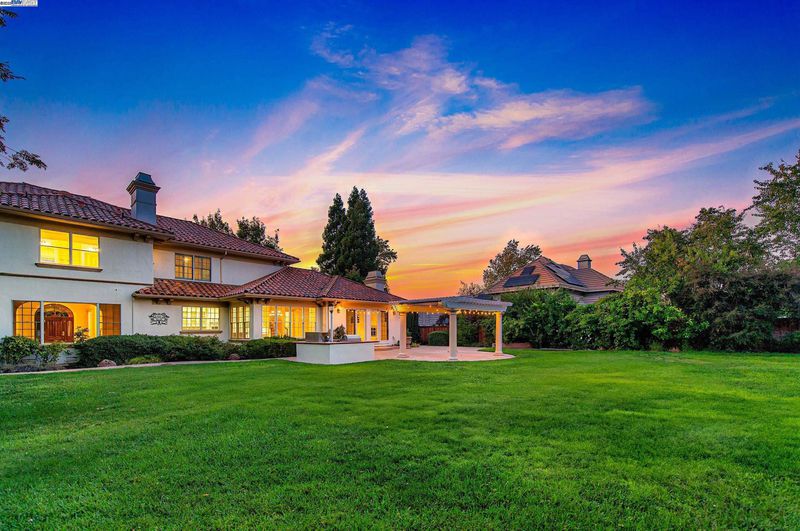 Elegant Italian Villa on a quiet court in gated community of Ruby Hill, sitting on a half-acre lot with a 3-car garage. The dramatic Grand Foyer is flanked by a cherry wood-paneled executive office and formal dining room, with a discreet staircase to the upper level. The formal living room features a fireplace, built-ins, and large picture windows overlooking the backyard. The kitchen includes a large island with vegetable sink and bar seating, Jenn-Air double ovens, gas range, stainless appliances, walk-in and butler’s pantries, plus a built-in desk. The breakfast nook is bright with two walls of windows. The family room showcases exposed wood beams, a raised-hearth fireplace, and sliding glass doors to the backyard. Main-floor bedroom with walk-in closet and nearby full bath with backyard access. Upstairs, the primary suite offers a fireplace, two entries to an exceptional walk-in closet, and an en suite bath with jetted tub, shower with seating, and dual vanities. Two additional bedrooms share a full bath. The backyard has a large patio with pergola, built-in BBQ, and a spacious lawn for a pool or ADU. Enjoy Ruby Hill amenities, top schools, and easy access to major routes, downtown Pleasanton, wineries & Silicon Valley.