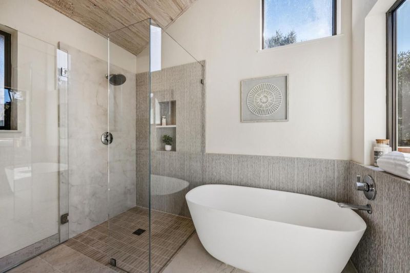- Bidet, Double Sinks, Full on Ground Floor, Primary - Oversized Tub, Primary - Stall Shower(s), Shower and Tub, Skylight, Tile