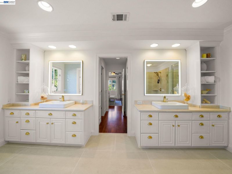 Shower Over Tub, Solid Surface, Tile, Updated Baths, Double Vanity