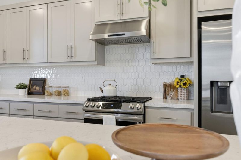 - Cooktop - Gas, Countertop - Quartz, Dishwasher, Exhaust Fan, Garbage Disposal, Hood Over Range, Island, Microwave, Oven - Gas, Pantry, Refrigerator
